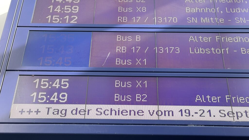 Der „Tag der Schiene“ ist in Schwerin vor allem ein Tag der Ersatzbusse – denn streng genommen ist der Tag der Schiene im Westen Mecklenburgs nur eine winzige Episode im Jahr der Generalsanierung. Wegen der Erneuerung der Strecke Hamburg-Berlin gibts in Schwerin kaum noch Schienenverkehr auf Bahnstrecken. Das wird auch bei den weißen und orangen Aushangfahrplänen am Bahnsteig deutlich: Um sie dennoch formatfüllend gestalten zu können, hat man sich geschätzt für den dreifachen Zeilenabstand entschieden.